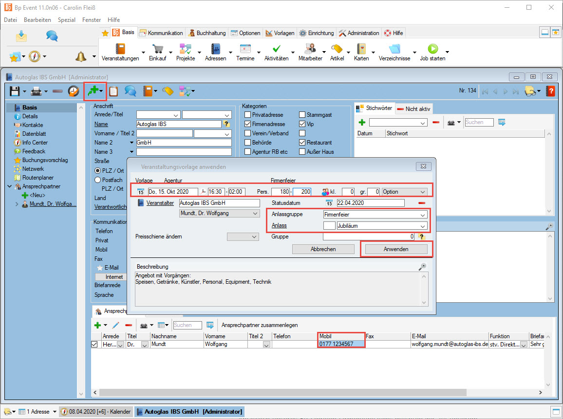 Firmenfeier. Das Fenster der Veranstaltungsneuanlage mit Vorlage öffnet sich. - Geben Sie die Daten aus der E-Mail ein. Mit der Tabulatortaste wechseln Sie einfach und schnell zu den darauffolgenden Eingabefeldern.