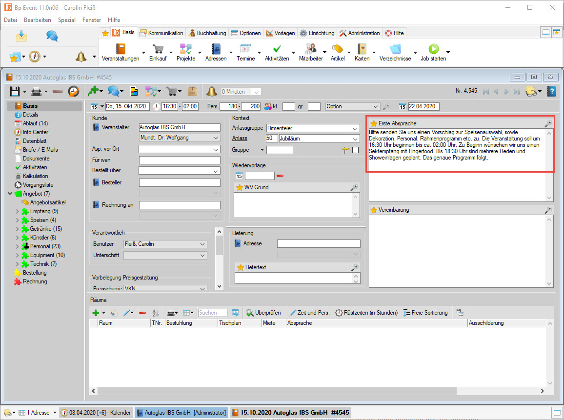- Ergänzen Sie die noch fehlenden Informationen aus der E-Mail von Herrn Mundt im Feld Erste Absprache rechts im Eingabefenster.