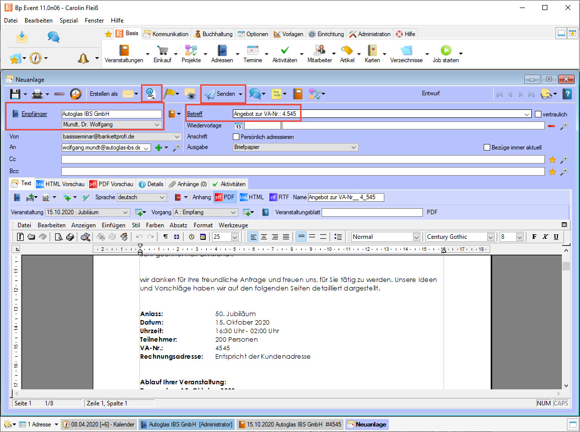 Angebot / Bestätigung 1. - Das Eingabefenster der Brief | E-Mail Neuanlage öffnet sich mit den Adressdaten des Veranstalters. Der Brief übernimmt automatisch alle relevanten Daten aus der Veranstaltung und den Text sowie die Formatierung aus der Textvorlage.