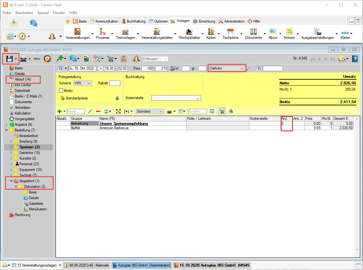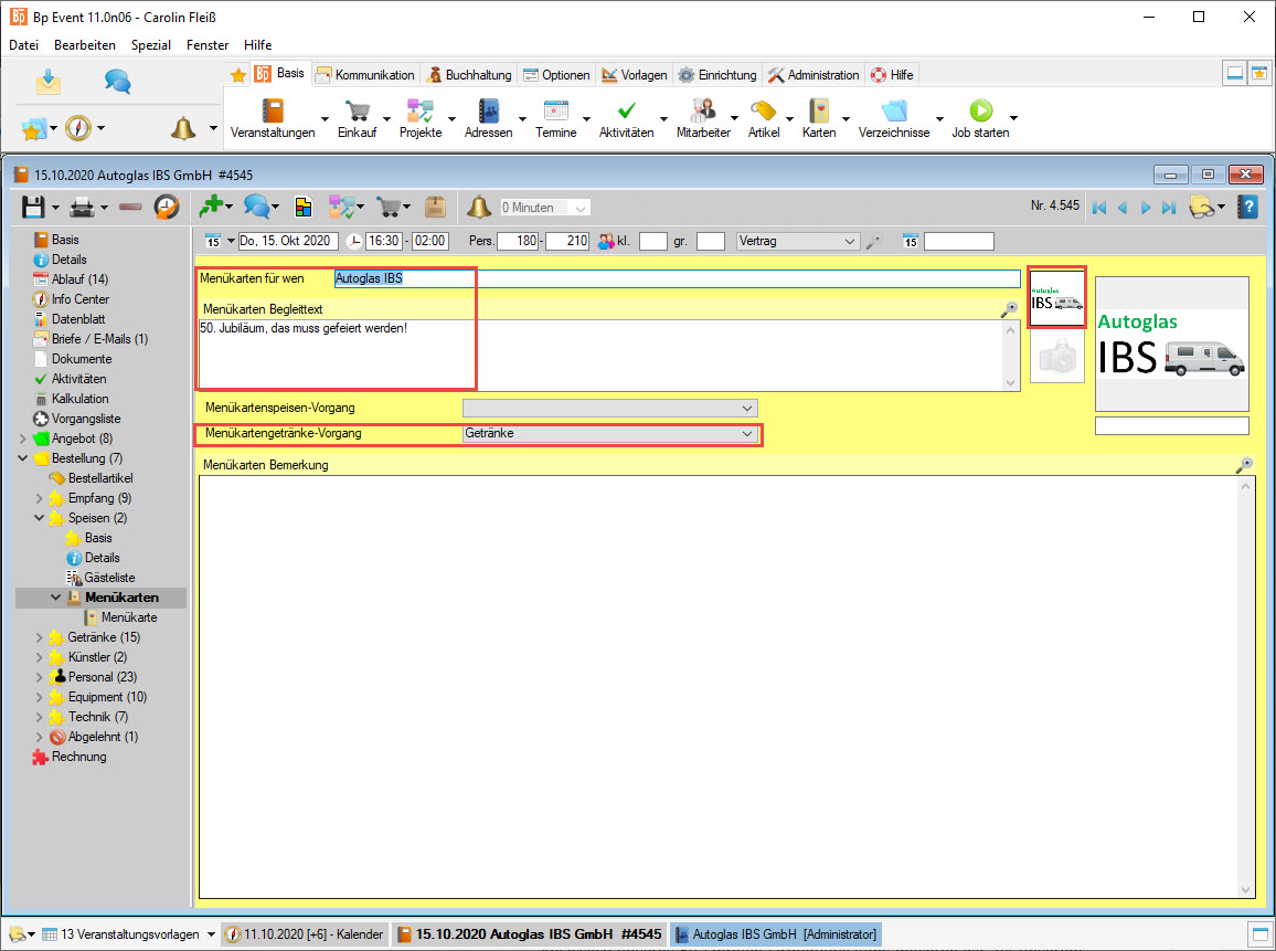 - Um die Menükarte für Autoglas IBS zu erstellen, klicken Sie in der linken Navigation der Veranstaltung auf den kleinen Pfeil vor dem Vorgang