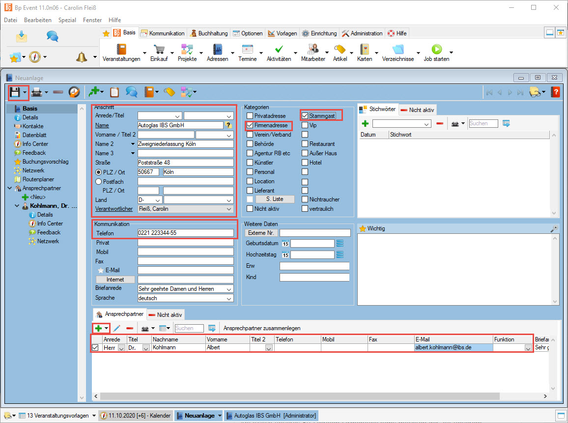 in der horizontalen Werkzeugleiste eine neue Adresse mit den oben genannten Angaben an. - Vergeben Sie die Kategorie Firmenadresse und Stammgast.