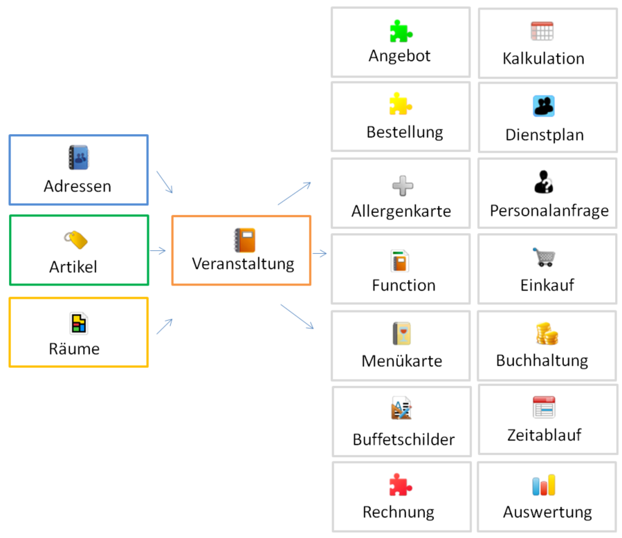 Die Basis für eine erfolgreiche Veranstaltungs- Abwicklung, ist eine übersichtliche und gepflegte Adressdatenbank, Räume/Locations (wenn vorhanden) und ein gut strukturierter und gepflegter Artikelstamm. In einer Veranstaltung werden alle Informationen gebündelt, daraus entstehen Angebote, Verträge, Arbeitsanweisungen und Rechnungen. Mit Hilfe von Vorlagen werden die Informationen übersichtlich strukturiert und entweder für den Postversand oder interne Zwecke ausgedruckt oder per E-Mail versandt. Jeglicher Schriftverkehr wird eindeutig zur Veranstaltung oder der Adresse abgelegt, auch nach vielen Jahren können Sie die Informationen wieder aufrufen.