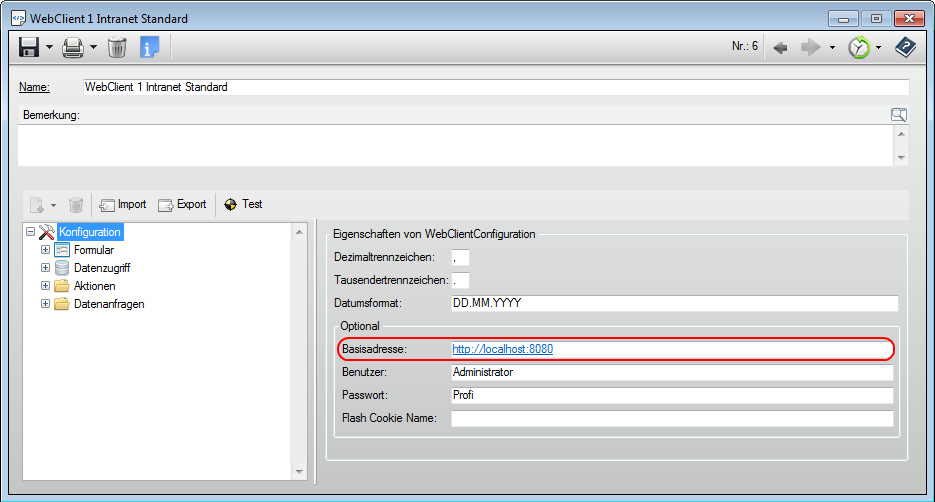 Wählen Sie den Menüpunkt Konfiguration und passen Sie die Basisadresse an, welche Ihrem Webserver entspricht. Wenn Ihr Webserver unter der IP-Adresse 192.168.0.10 und dem Port 3456 erreichbar ist, dann müssen sie bei der Basisadresse die Eintragung http://192.168.0.10:3456 vornehmen.