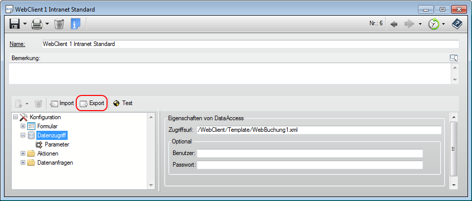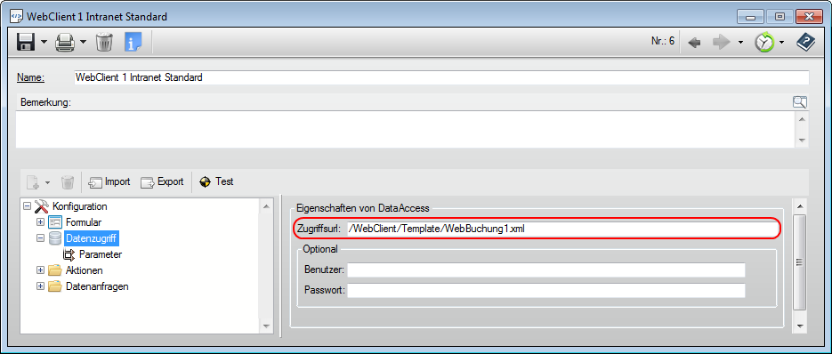 Es wurde ein Template mit dem Namen WebBuchung1.xml erzeugt. In der Zugriffs-URL wird nun der entsprechende Pfad (absolut oder relativ) zur Datei angegeben. Der relative Pfad bezieht sich immer auf den Ordner WebFolder im Verzeichnis Daten. Im abgebildeten Beispiel ist dies /WebClient/Template/WebBuchung1.xml.