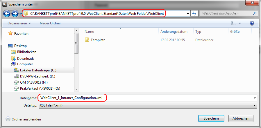 Bei der Abfrage nach dem Speicherort wählen Sie das Verzeichnis WebClient im Ordner WebFolder. Als Dateinamen vergeben Sie die Bezeichnung, die Sie in der HTML-Datei (siehe Seite 7, untere Abbildung) den Objekten drei bis sechs zugewiesen haben und fügen den Suffix _Configuration.xml an.