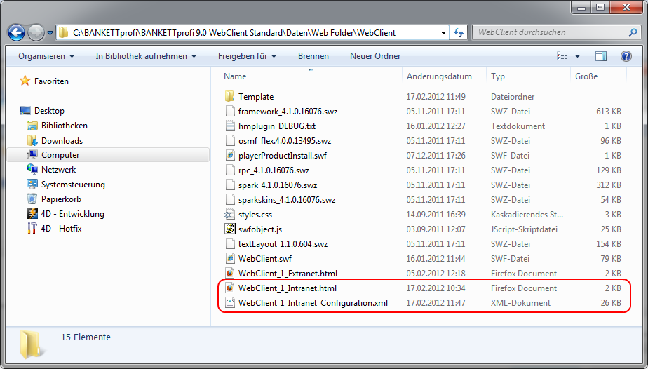 Im Ordner WebClient befinden sich bei der Auslieferung zwei HTML-Dateien. Bei der Konfiguration für das Intranet wird die WebClient_1_Intranet.html angepasst. Dazu müssen Sie diese HTML-Datei mit einem Editor öffnen.